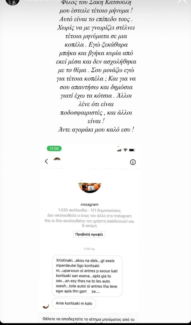 Η Χριστίνα Κεφαλά λοιπόν έδωσε δημόσια την απάντησή της: "Φίλος του Σάκη Κατσούλη μου έστειλε τέτοιο μήνυμα! Αυτό είναι το επίπεδο τους. Χωρίς να με γνωρίζει στέλνει τέτοια μηνύματα σε μια κοπέλα. Εγώ ξεκάθαρα μπήκα και βγήκα κυρία από εκεί μέσα και δεν ασχολήθηκα με το θέμα. Σου μοιάζω εγώ για τέτοια κοπέλα; Και για να σου απαντήσω και δημόσια γιατί έχω και κότσια. Άλλοι λένε ότι είναι ποδοσφαιριστές και άλλοι είναι! Άντε αγοράκι μου καλό εσύ".