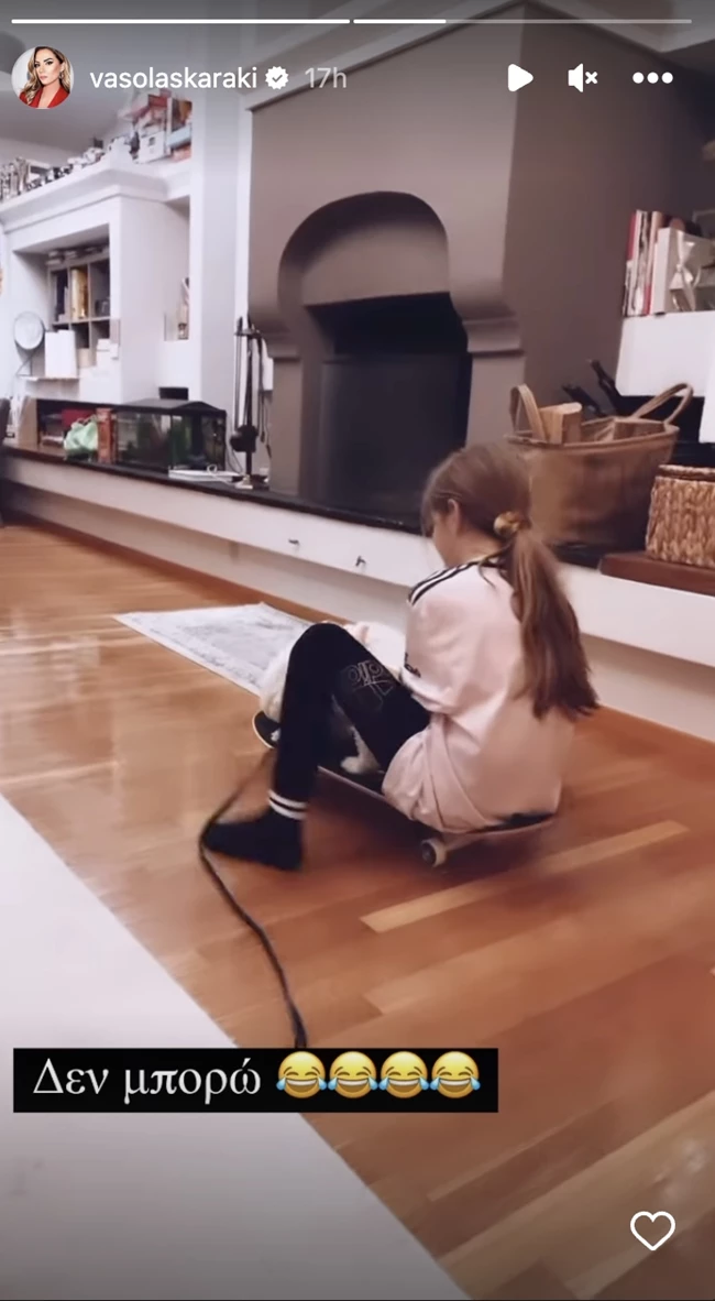 Όπως έγινε και πριν λίγες ώρες, με την περήφανη μαμά να απαθανατίζει την Εύα να κάνει skateboard στο τεράστιο σαλόνι τους, στο οποίο επικρατεί το γκρί, το χρώμα του ξύλου αλλά και άλλα γήινα χρώματα, που δίνουν στον χώρο μια απέραντη ζεστασιά. Πάνω στο skateboard, μαζί με τη μικρή, ήταν και το λευκό σκυλάκι τους - μια εικόνα που μας έκανε να "λιώσουμε".