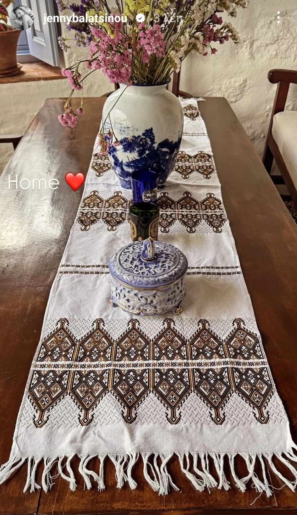 Η Τζένη Μπαλατσινού δημοσίευσε μία φωτογραφία από την αρκετά εντυπωσιακή τραπεζαρία της. Η ίδια έχει επιλέξει ένα μεγάλο ξύλινο τραπέζι με ασορτί καρέκλες. Όπως βλέπουμε επάνω ένα τοποθετήσει ένα λευκό τραπεζομάντιλο μέσης με ιδιαίτερα σχέδια.