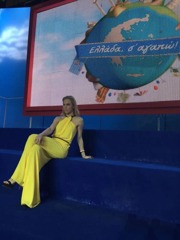 Η όμορφη ηθοποιός και παρουσιάστρια επέλεξε μια κίτρινη φόρμα του σχεδιαστή Στέλιου Κουδουνάρη με μία ζώνη από μαύρο κορδόνι. Το styling επιμελήθηκε η ταλαντούχα Ίρις Λεονταρίτη, τα μαλλιά o Σπύρος Σαμοίλης και το μακιγιάζ η Έλσα Πρωτοψάλτη.