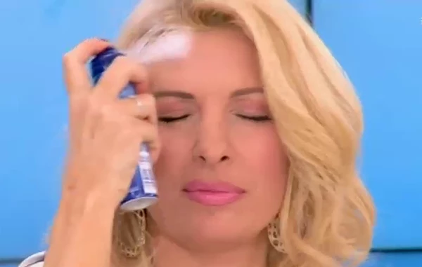 Η παρουσιάστρια στην προσπάθεια της να ανακουφιστεί από τον πόνο έβαλε παγωμένα φύλλα ζύμης και στη συνέχεια έριξε ψυκτικό σπρέι απευθυνόμενη στους συνεργάτες της που τους είπε: «Ό,τι και να λέτε εγώ δεν θέλω να είμαι σημαδεμένη στο πρόσωπο. Θα τα βάλω όλα! Ζωντανή εκπομπή είμαστε! Ο κόσμος ξέρει…»