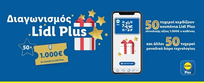 50 τυχεροί χρήστες θα κερδίσουν (ο καθένας) χρηματικά εκπτωτικά κουπόνια Lidl Plus συνολικής αξίας 1.000€.