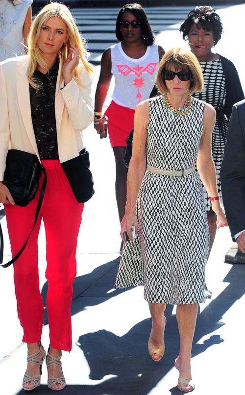 Φυσικά, από την επίδειξη δεν θα μπορούσε να λείπει και η διευθύντρια της αμερικάνικης Vogue, Anna Wintour η οποία κατέφθασε μαζί με τη Maria Sharapova φορώντας για μια ακόμα φορά τα γνωστά μπεζ πέδιλά της.