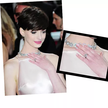 Η Anne Hathaway ήταν και αυτή ανάμεσα στις διάσημες που επέλεξαν την safe nude απόχρωση συνδυαστικά με το χρώμα του φορέματός της. Όμως για να ξεχωρίσει πρόσθεσε λίγη ασημένια λάμψη σε ένα μόνο νύχι και αναβάθμισε το ίσως βαρετό μανικιούρ της