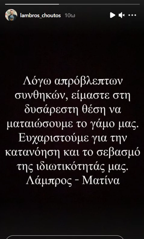 Δυστυχώς, όμως, έπεσαν απότομα οι τίτλοι τέλους για το άλλοτε πολύ ερωτευμένο ζευγάρι, με την ανακοίνωση του Λάμπρου Χούτου να πέφτει σαν κεραυνός εν αιθρία. Πιο συγκεκριμένα, ο παλαίμαχος διεθνής ποδοσφαιριστής ανέβασε ένα στόρι στον προσωπικό του λογαριασμό στο Instagram λέγοντας πως : "Λόγω απρόβλεπτων συνθηκών, είμαστε στη δυσάρεστη θέση να ματαιώσουμε τον γάμο μας. Ευχαριστούμε για την κατανόηση και τον σεβασμό της ιδιωτικότητάς μας".