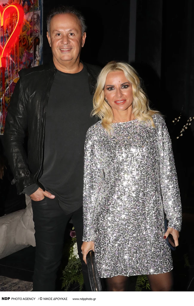 Το ζευγάρι χαμογέλασε στους φωτογράφους με τη Μαρία Μπεκατώρου να κλέβει τις εντυπώσεις με το μίνι φόρεμα της με ασημί παγιέτες.