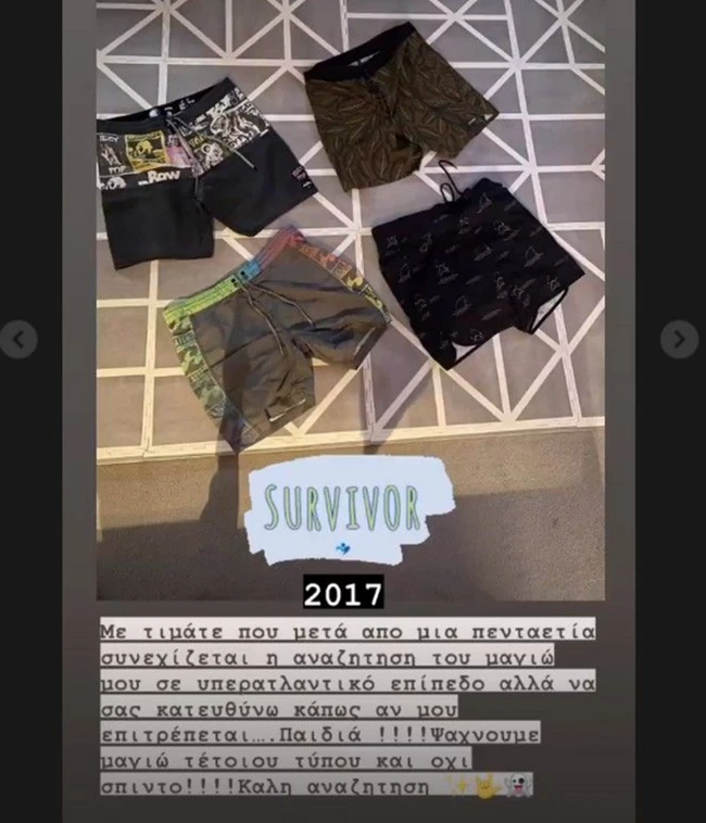 Ειδικότερα, ανέβασε μία φωτογραφία με τέσσερα μαγιό του και σημείωσε: Με τιμάτε που μετά από μια πενταετία συνεχίζεται η αναζήτηση του μαγιό μου σε υπερατλαντικό επίπεδο, αλλά να σας κατευθύνω κάπως αν μου επιτρέπεται... Παιδιά!!! Ψάχνουμε μαγιό τέτοιου τύπου και όχι σπίντο! Καλή αναζήτηση".