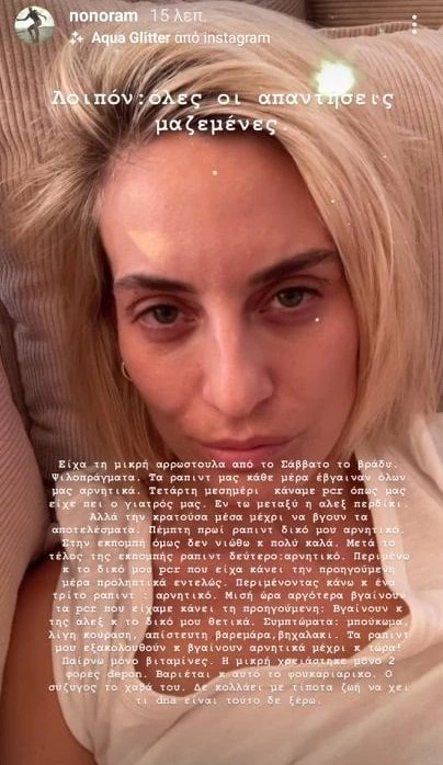''Είχα τη μικρή αρρωστούλα από το Σάββατο το βράδυ. Ψιλοπράγματα. Τα ραπιντ μας κάθε μέρα έβγαιναν όλων μας αρνητικά. Τετάρτη μεσημέρι κάναμε pcr όπως μας είχε πει ο γιατρός μας. Εν τω μεταξύ η Άλεξ περδίκι. Αλλά την κρατούσα μέσα μέχρι να βγουν τα αποτελέσματα. Πέμπτη πρωί ραπιντ δικό μου αρνητικό. Στην εκπομπή όμως δεν νιώθω και πολύ καλά. Μετά το τέλος της εκπομπής ραπιντ δεύτερο, αρνητικό. Περιμένω και το δικό μου pcr που είχα κάνει την προηγούμενη μέρα προληπτικά εντελώς. Περιμένοντας κάνω και ένα τρίτο ραπιντ αρνητικό.