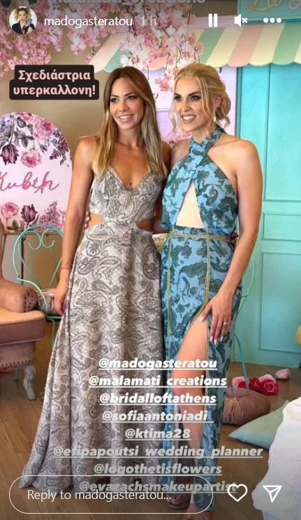 Η Μαντώ Γαστεράτου φόρεσε ένα πολύ ιδιαίτερο εμπριμέ μπλε halter neck φόρεμα με έντονο σκίσιμο στο πόδι, αλλά και ένα λευκό midi φόρεμα με voluminous μανίκια, για το μυστήριο. Η νονά Ζωή Κρονάκη από την άλλη φόρεσε ένα λευκό παντελόνι κι ένα ημιδιάφανο top με έντονους όγκους από τούλι σε ροζ απόχρωση.