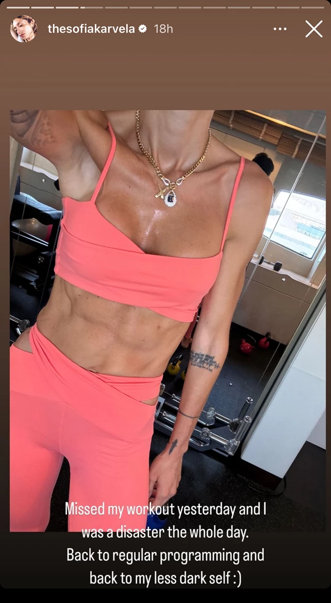 "Έχασα την προπόνησή μου χτες και νιώθω πτώμα όλη μέρα σήμερα. Πίσω στο γνωστό πρόγραμμα γυμναστικής μου, πίσω στον λιγότερο σκοτεινό εαυτό μου", έγραψε με χαμόγελο στο story της.