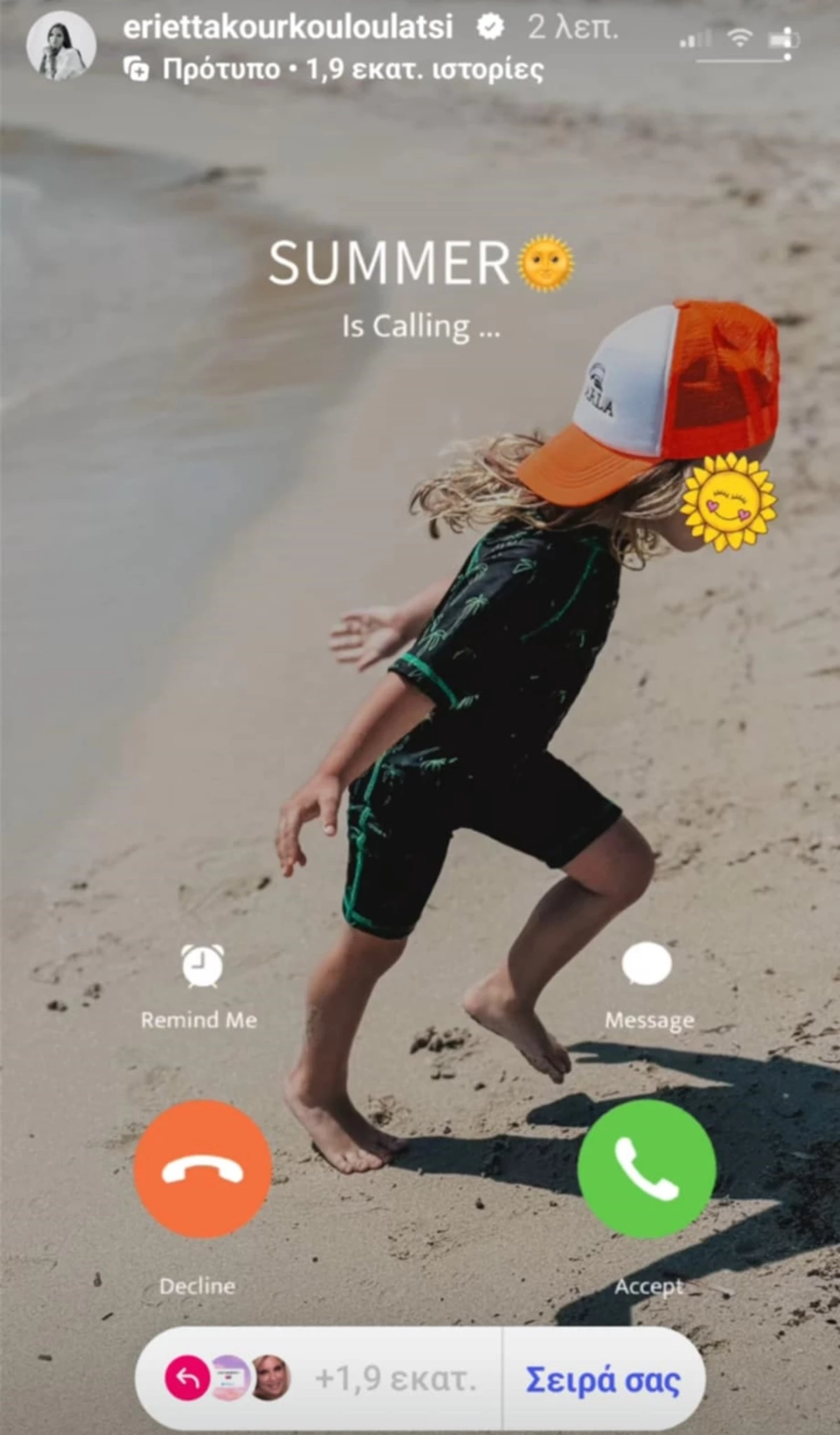 Στο νέο άκρως καλοκαιρινό trend του Instagram υπέκυψε η Εριέττα Κούρκουλου Λάτση. Η κόρη της Μαριάννας Λάτση και του Νίκου Κούρκουλου ανέβασε στο Instagram Story της μια φωτογραφία του γιου της, Νίκου ακολουθώντας τη μόδα του "Summer is calling" και μας ταξίδεψε.