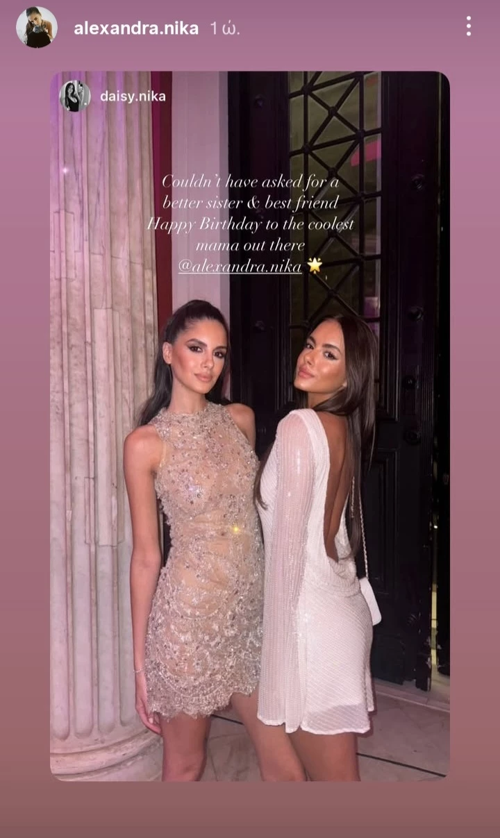 Η Αλεξάνδρα Νίκα κλείνει σήμερα τα 26 της χρόνια και η μικρότερη αδερφή της, Νταίζη, με την οποία η ομοιότητα είναι εμφανής, έσπευσε να της ευχηθεί με τρυφερά λόγια για τα γενέθλιά της. "Δεν θα μπορούσα να ζητήσω καλύτερη αδερφή και κολλητή. Χαρούμενα γενέθλια στην πιο κουλ μαμά εκεί έξω", έγραψε στο story της στο instagram.