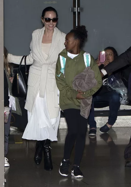 Η οικογένεια έμοιαζε κουρασμένη μα και ευδιάθετη, με την Angelina να μοιάζει έως και ευτυχισμένη! Για το ταξίδι της φόρεσε μία midi πλισέ φούστα και ένα lingerie τοπ κάτω από μία πλεκτή μακριά ζακέτα με ζώνη.