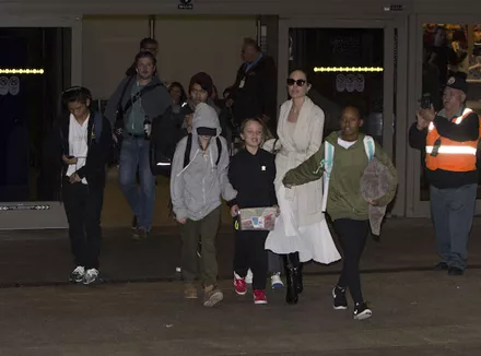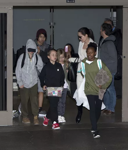 Angelina Jolie lands at LAX with her children after catching a flight from London.