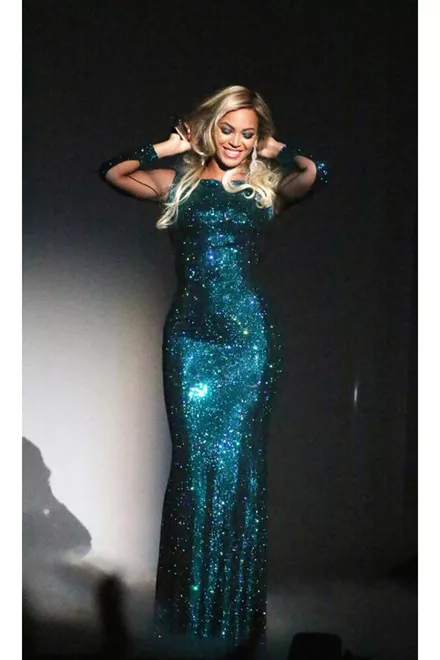 Αξίζει να σημειωθεί, ότι για μια ακόμα φορά, η επιτυχημένη καλλιτέχνης τίμησε τον Έλληνα σχεδιαστή Vrettos Vrettakos, φορώντας μια δική του δημιουργία. Συγκεκριμένα, ο ενδυματολόγος Διονύσης Κολποδίνος επέλεξε για την Beyonce μια μάξι κρυστάλλινη τουαλέτα κεντημένη με 400.000 κρύσταλλα Swarovski στο χρώμα του blue zirgon, η οποία τόνιζε τις καμπύλες της.