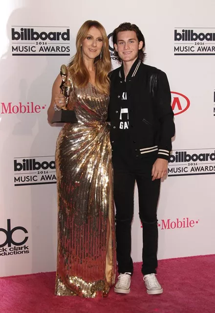 Η Celine Dion με ένα χρυσό φόρεμα και τον γιο της Rene Charles στο πλευρό της