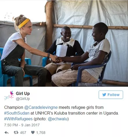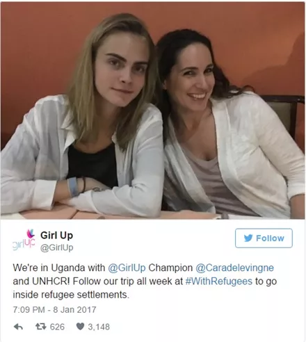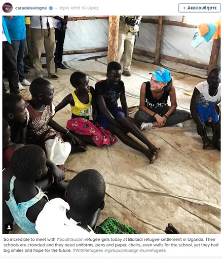Η Cara Delevingne έχει λάμψη διά της... απουσίας της από το κόκκινο χαλί αλλά και το μόντελινγκ τους τελευταίους μήνες. Τι έχει συμβεί; Η ίδια έδωσε την απάντηση μέσα από τα social media αποκαλύπτοντας πως αυτή τη στιγμή "βιώνει την πιο εκπληκτική εμπειρία της ζωής της". Το 24χρονο μοντέλο συνεργάζεται τους τελευταίους μήνες με την καμπάνια Girl Up των Ηνωμένων Εθνών ενώ πρόσφατα έκανε ένα ταξίδι στην Uganda, για να επισκεφτεί τις κατασκηνώσεις των προσφύγων που διέφυγαν από το Νότιο Σουδάν.