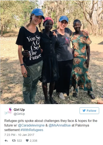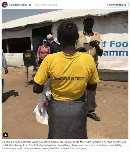 "Σήμερα γνώρισα πολλά κορίτσια στον καταυλισμό BidiBidi. Χρειάζονται στολές, μολύβια, χαρτί, καρέκλες ακόμα και τοίχους για τα σχολεία τους όμως έχουν ελπίδα για το μέλλον και χαμογελούν."
