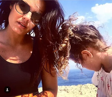 Η Ζήνα Κουτσελίνη φωτογραφίζεται στην παραλία της Σκοπέλου, στην οποία παίζει με την κορούλα της