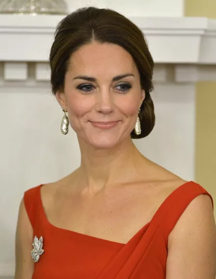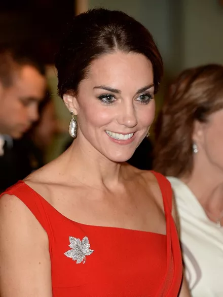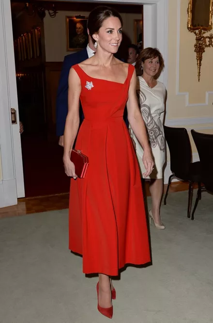 Με κόκκινο φόρεμα Preen, clutch τσαντάκι Jenny Packham και την ίδια καρφίτσα με το σήμα του Καναδά έδωσε το παρών η Kate.