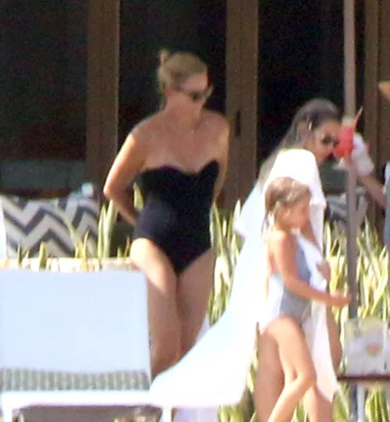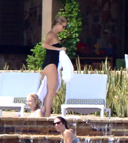 Η ίδια επέλεξε να φορέσει ένα strapless μαύρο ολόσωμο μαγιό ενώ την περισσότερη ώρα είχε δεμένη γύρω της μία πετσέτα.