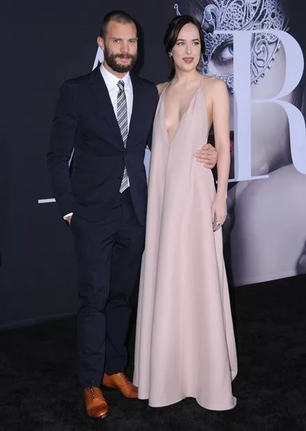 Η πρωταγωνίστρια φόρεσε ένα σατέν μακρύ φόρεμα με αποκαλυπτικό ντεκολτέ. Στο πλευρό της φυσικά ήταν ο συμπρωταγωνιστής της, Jamie Dornan, ο οποίος εμφανίστηκε με το νέο του look.