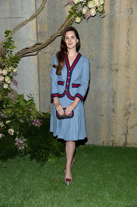 Η Lana Del Rey πόνταρε σε ένα πιο κλασικό, πλην ιδιαίτερο γαλάζιο ταγιέρ με κόκκινο και μπλε σιρίτι, που μας γυρίζει πίσω στις σχολικές ποδιές του 50 - και πολύ μας αρέσει!