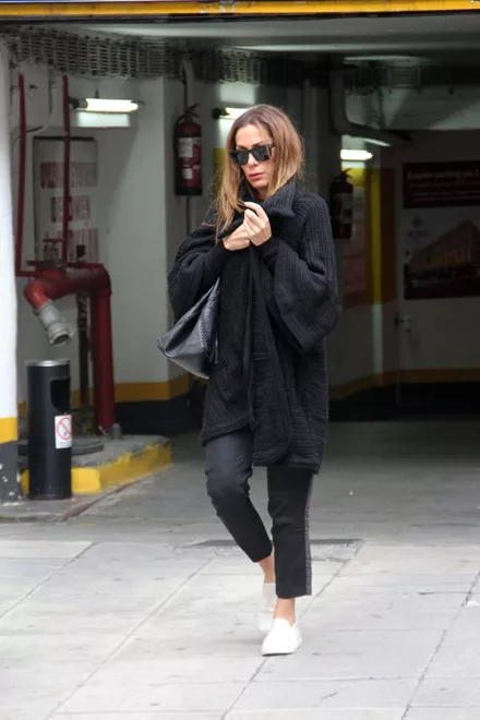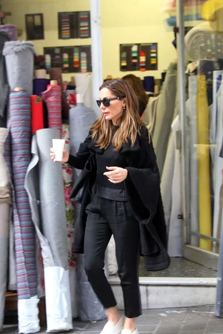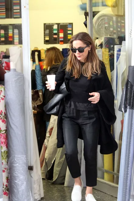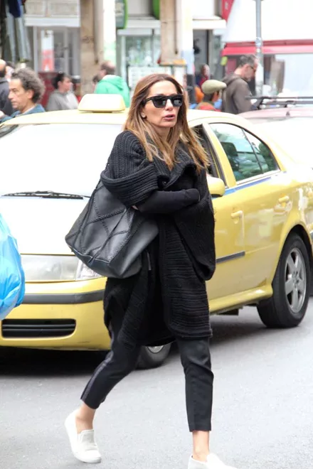 Κομψή όπως πάντα, φορώντας ένα μαύρο παντελόνι και μαύρη ζακέτα, με casual chic εμφάνιση και αθλητικά παπούτσια, επισκέφτηκε μαγαζιά με υφάσματα και έκανε βόλτα στα στενά δρομάκια στο Μοναστηράκι.