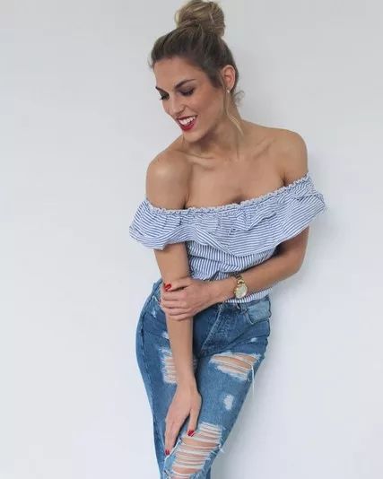 Ανοιξιάτικη casual μα και τόσο γλυκιά η Μαντώ Γαστεράτου συνδυάζει το ψηλόμεσο τζιν με ένα έξωμο μπλουζάκι με ρίγες που θα φοράς μέχρι το καλοκαίρι