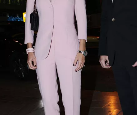 Η παρουσιάστρια του Alpha επέλεξε για την βραδιά ένα sur mesure κοστούμι DIMITRIS PETROU σε dusty pink χρώμα, ασορτί ροζ τοπ Wolford, ψηλοτάκουνες γόβες Dukas, μαύρη τσάντα Chanel, ενώ το look της ολοκλήρωσε με μοτίφ σταυρό Eleni Vovou Jewellery και φυσικά το Pink Ribbon Bracelet.