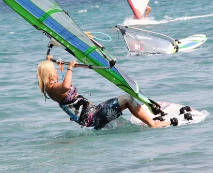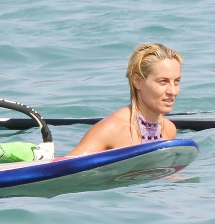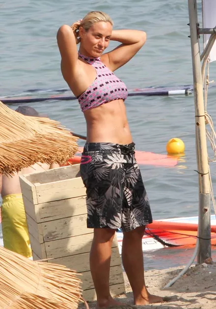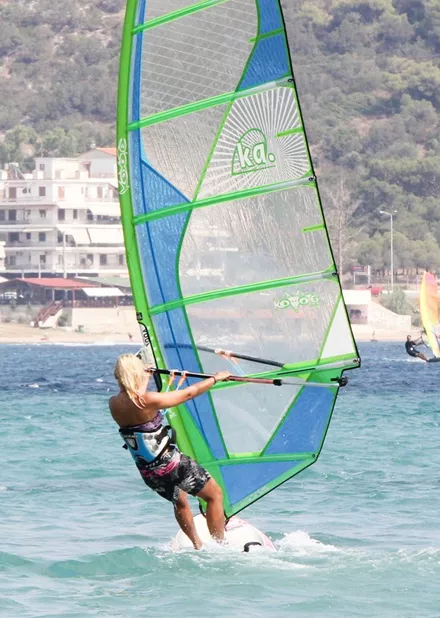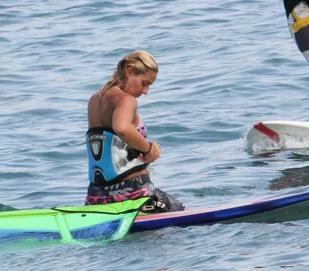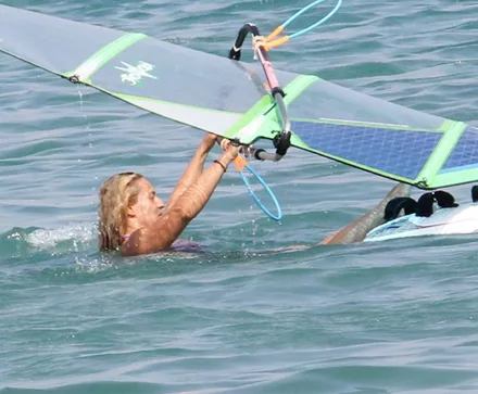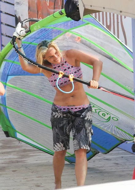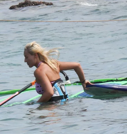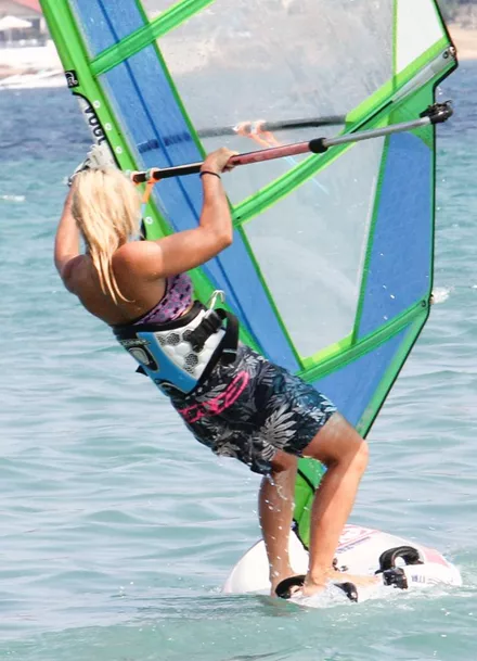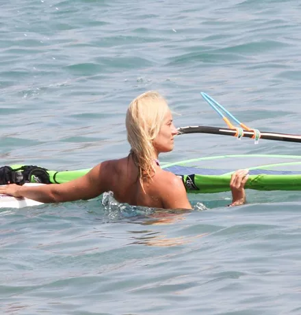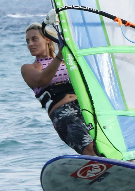 Ο φωτογραφικός φακός απαθανάτισε την Ελεονώρα Μελέτη σε παραλία της Αναβύσσου να επιδίδεται στο αγαπημένο της θαλάσσιο σπορ, το windsurfing.