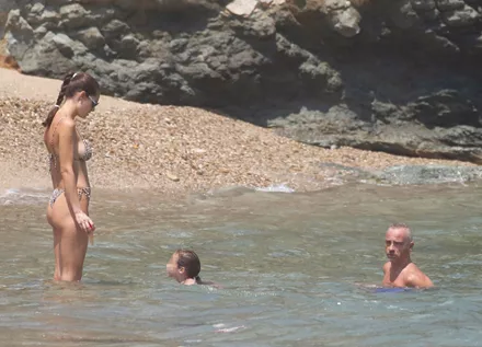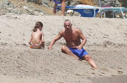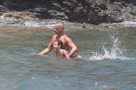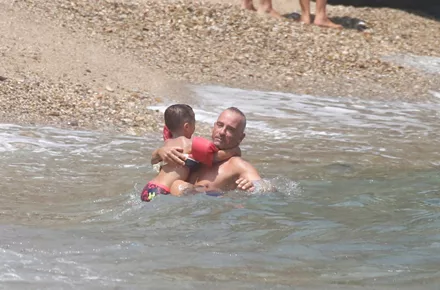 Ο φωτογραφικός φακός απαθανάτησε τον Eros Ramazzotti να παίζει και να κάνει βουτιές με την οικογένειά του σε γνωστή παραλία της Μυκόνου.