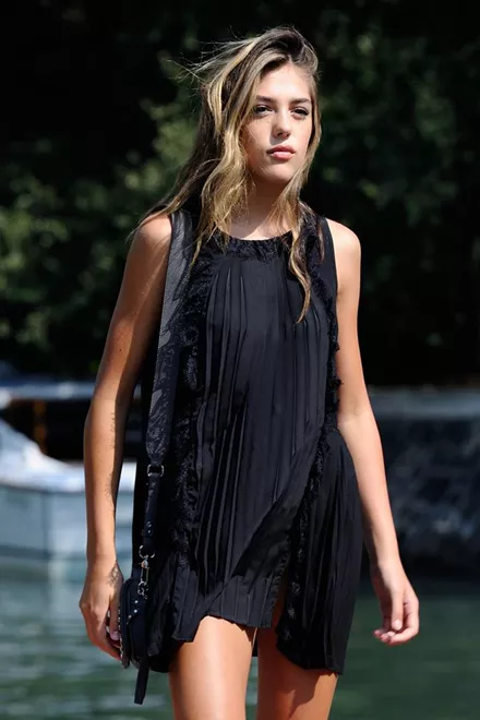 Η 18χρονη κατέφτασε στη Βενετία την ίδια ημέρα φορώντας ένα μίνι μαύρο φόρεμα με πλισέ και sneakers, αναδεικνύοντας έτσι τα καλλίγραμμα πόδια της.
