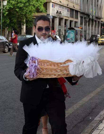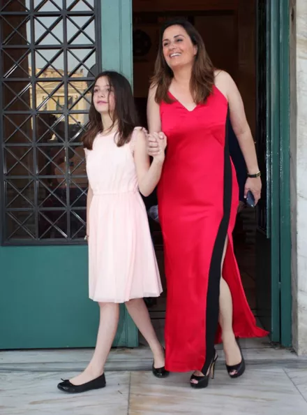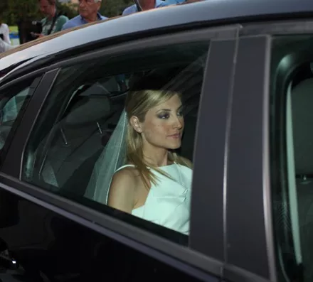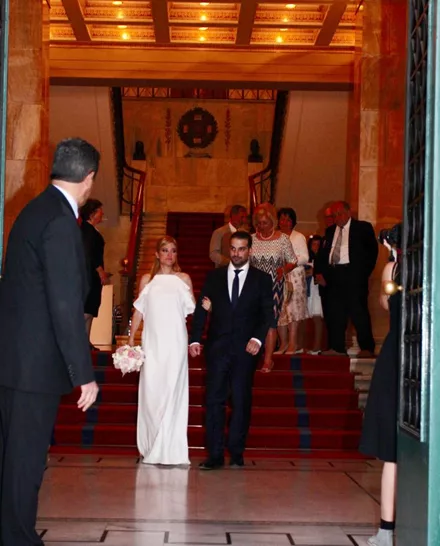 Η νύφη έφτασε στο Δημαρχείο φορώντας ένα μακρύ ξώπλατο λευκό φόρεμα, ενώ ο Γαβριήλ Σακελλαρίδης ένα μπλε κουστούμι και γραβάτα που φορά σπάνια.