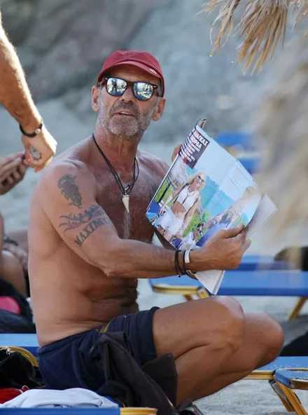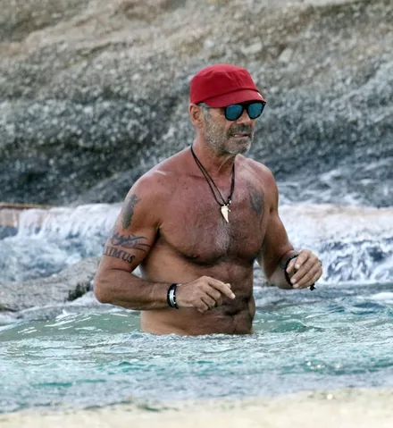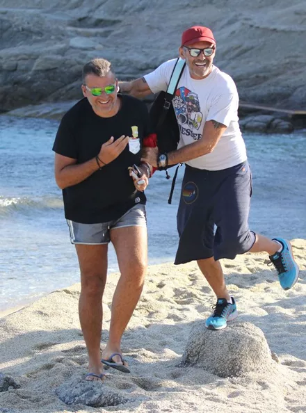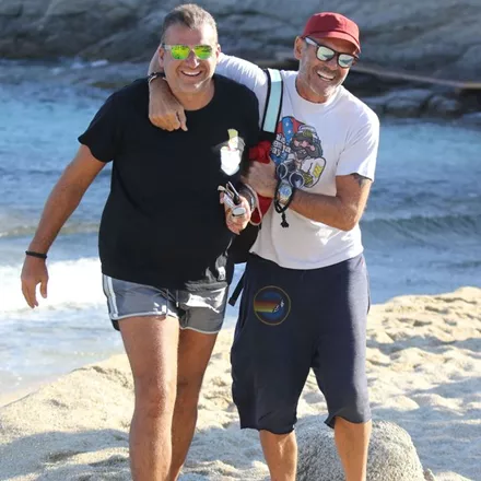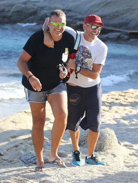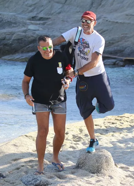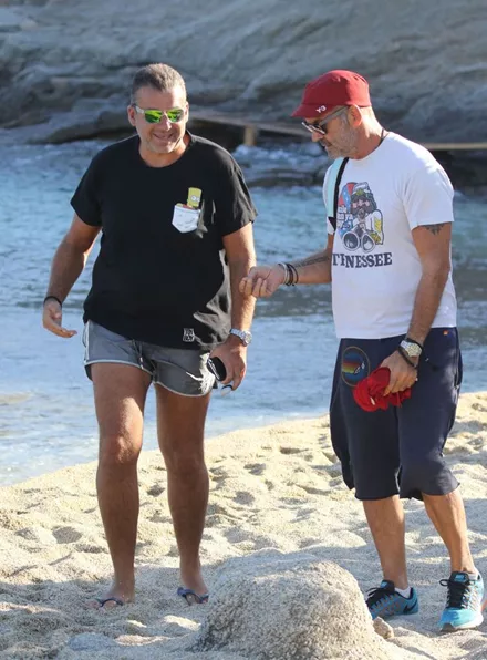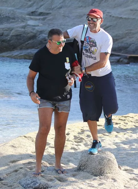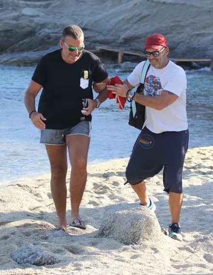 Σε παραλία της Μυκόνου να απολαμβάνουν τις βουτιές τους απαθανάτισε ο φωτογραφικός φακός τους δυο φίλους, Πέτρο Κωστόπουλου και Γιώργο Λιάγκα.
