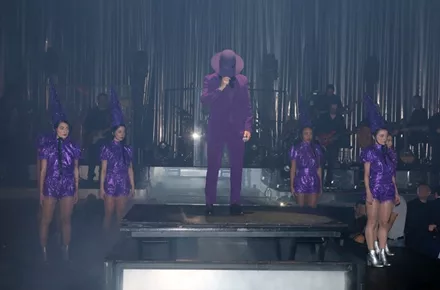 Συνοδευόμενος από πολυμελές μπαλέτο και φορώντας ένα θεατρικό μοβ κοστούμι, ο Γιώργος Μαζωνάκης έκανε την είσοδό του στο stage και καταχειροκροτήθηκε από το κοινό που κατέκλυσε το γνωστό στέκι για να τον απολαύσει σε ένα show που ακροβατεί ανάμεσα στα όρια του λαϊκού προγράμματος και της μουσικής παράστασης.