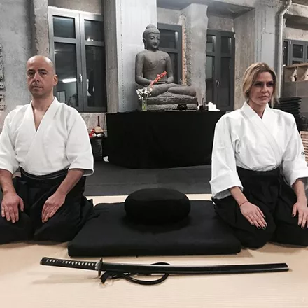 Η Τζένη Μπαλατσινού με τον δάσκαλο sensei Iaido & Aikido Πέτρο Μουλαγιάννη