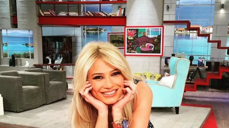 Η Φαίη Σκορδά χαμογελάει στη φωτογραφία από το στούντιο της εκπομπής της