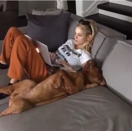 Η Δούκισσα Νομικού φωτογραφίζεται με το σκύλο της ενώ δουλεύει