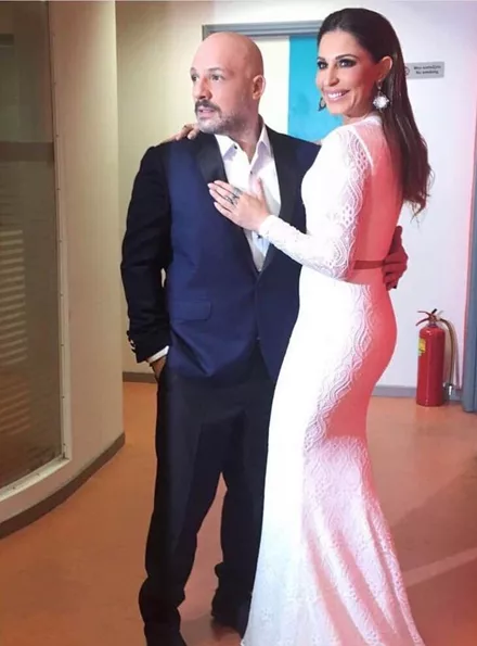 Ο Νίκος Μουτσινάς με την Κατερίνα Παπουτσάκη σε backstage φωτογραφία από την εκπομπή Your Face Sounds Familiarr