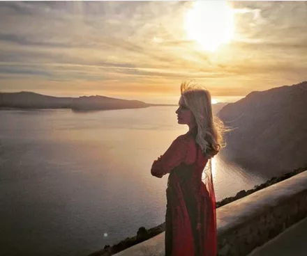 Η Ελένη Μενεγάκη φωτογραφίζεται στο περίφημο ηλιοβασίλεμα της Σαντορίνης