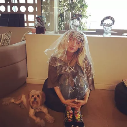Η Μαρία Ηλιάκη σε αυτοσαρκαστική διάθεση, περιμένει με το σκυλάκι της να «πιάσει» η βαφή