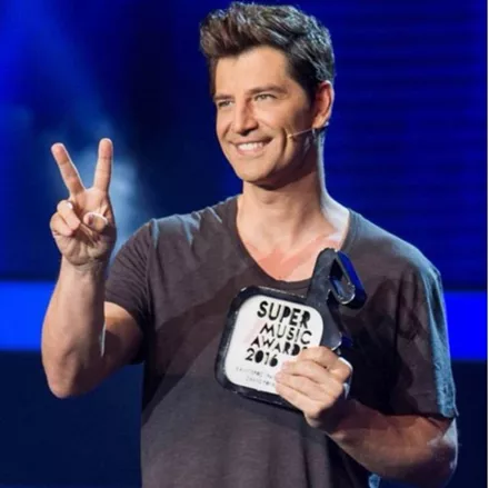 Ο Σάκης Ρουβάς ποζάρει με το βραβείο του από τα Super Music Awards 2016
