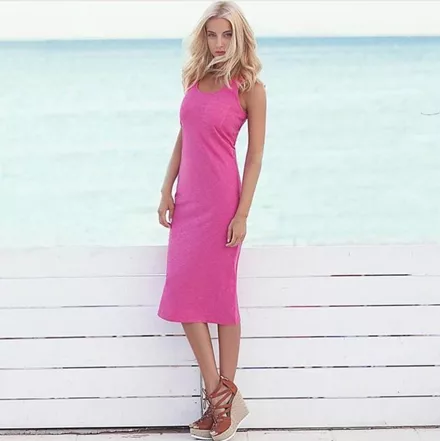Η Δούκισσα Νομικού στα πλαίσια μιας φωτογράφησης με ένα ροζ καλοκαιρινό φόρεμα