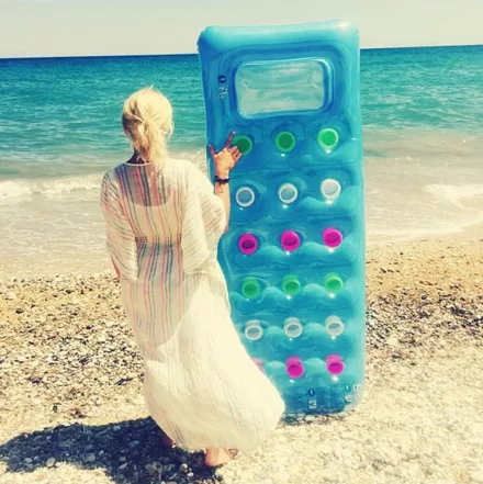 Η Μαρία Μπεκατώρου καλημερίζει τους διαδικτυακούς της φίλους κρατώντας ένα χρωματιστό στρώμα θαλάσσης