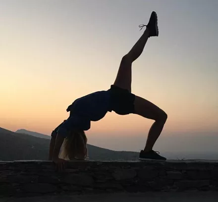 Η Έλενα Παπαβασιλείου γυμνάζεται στο ηλιοβασίλεμα επηρεασμένη απ' ότι η ίδια αναφέρει, από την Ολυμπιάδα