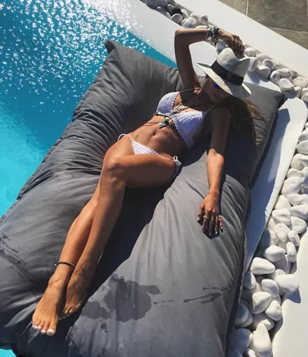 Η Αθηνά Οικονομάκου σε ένα στρώμα, απολαμβάνει τον ήλιο της Μυκόνου