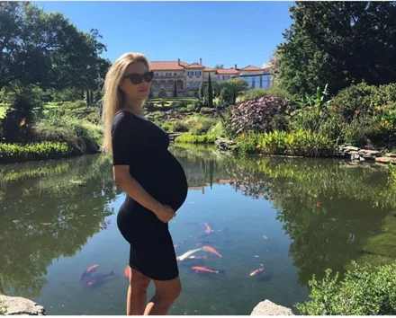 Η μελλοντική μανούλα Χριστίνα Αλούπη φωτογραφίζεται σε μια λίμνη με την πολύ φουσκωμένη κοιλίτσα της