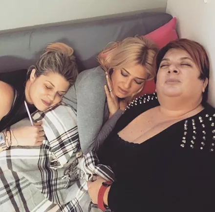 Η Φαίη Σκορδά με τις συνεργάτιδές της σε ένα ολιγόλεπτο διάλειμμα