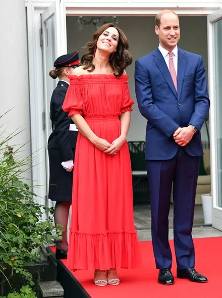Η Kate Middleton επέλεξε να φορέσει ένα κόκκινο Alexander McQueen φόρεμα, το οποίο συνδύασε με ένα ζευγάρι nude πέδιλα Prada.